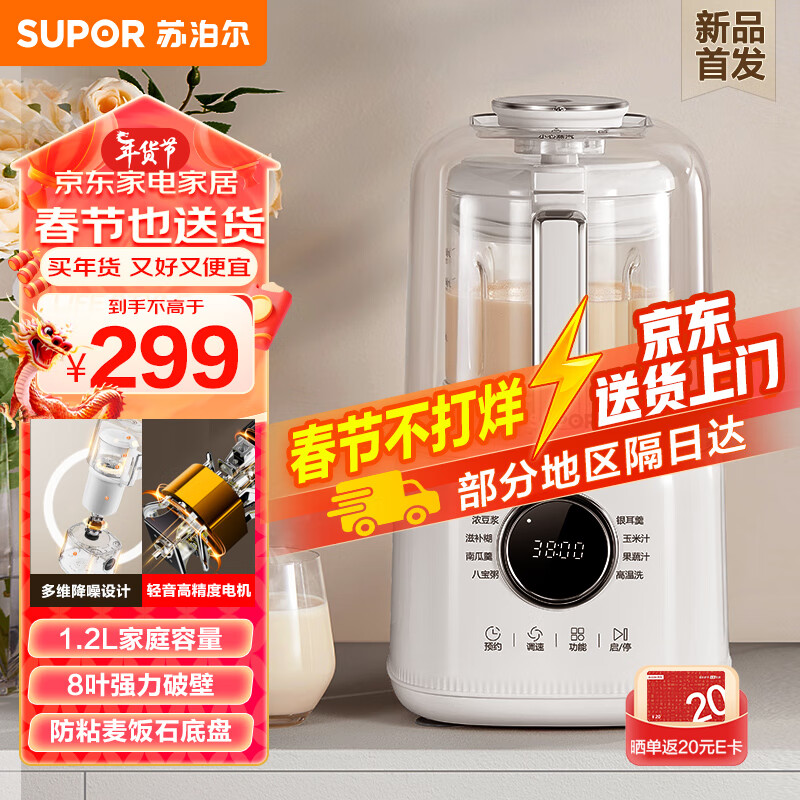 苏泊尔(SUPOR)低音降噪破壁机 1.2L家用豆浆机可预约加热保温榨汁机早餐机辅食机年货送长辈 SPD006S价格:279.00元!