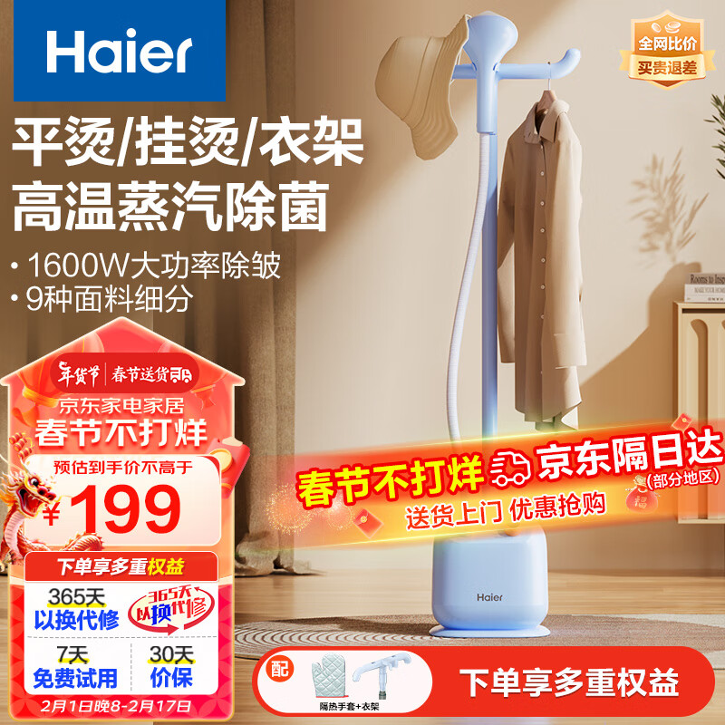 海尔(haier)蒸汽挂烫机家用 2.5L单杆多功能熨烫机 手持挂烫机电熨斗熨衣机 HY-GD1802A价格:198.00元!