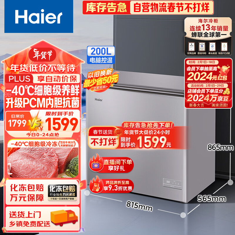 海尔(Haier)200升-40℃智控低霜小冰柜家用商用 冷藏柜冷冻柜冰柜小型小冰箱小型冷柜BC/BD-200GHEPC 以旧换新价格:1699.00元!
