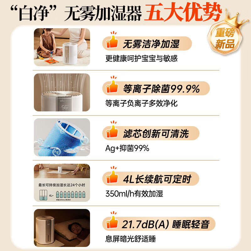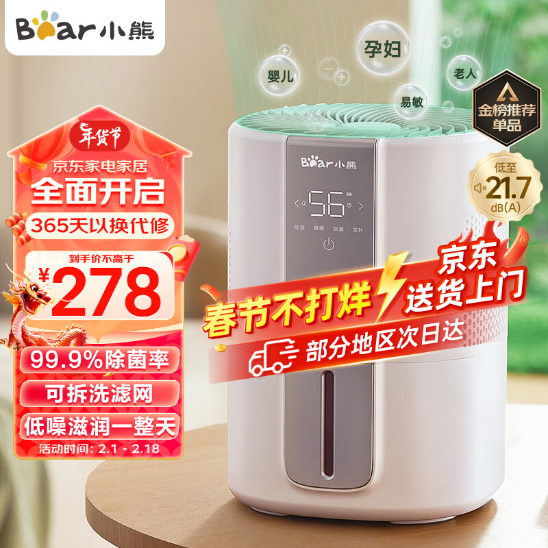 小熊(Bear)无雾加湿器 卧室婴儿用办公室大容量 家用低噪智能恒湿母婴空气加湿桌面JSQ-F40J1价格:278.00元!