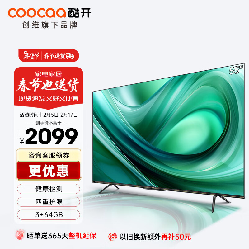 酷开创维 55英寸陪伴屏电视 3+64G 健康检测 防蓝光护眼 视频通话 120Hz高刷智能电视机以旧换新55P60P价格:2499.00元!