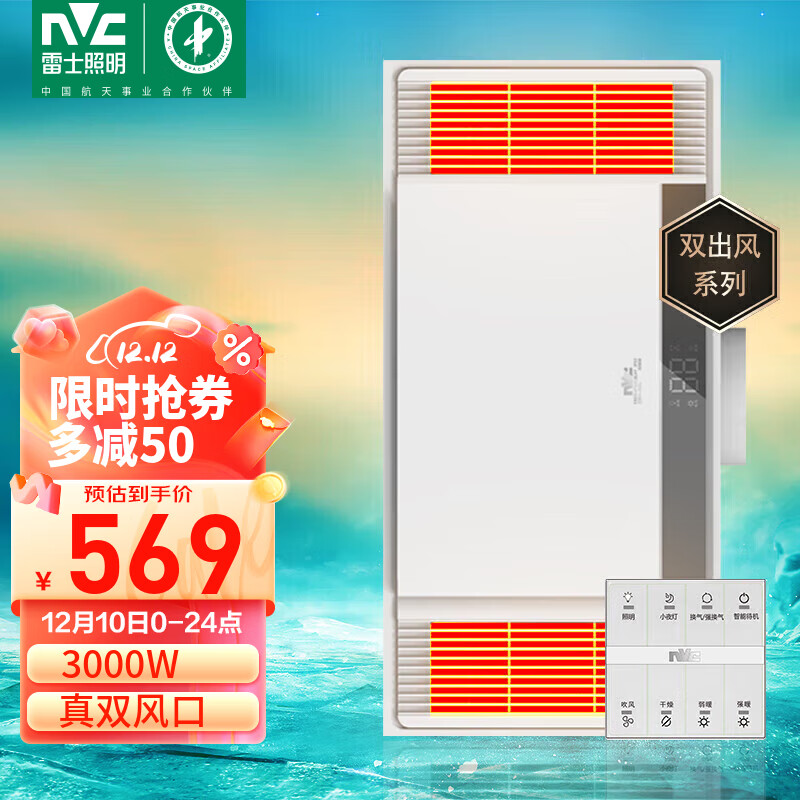 雷士(NVC)双风口取暖/换气风暖浴霸排气扇照明一体卫生间暖风机浴室取暖器价格:879.00元!