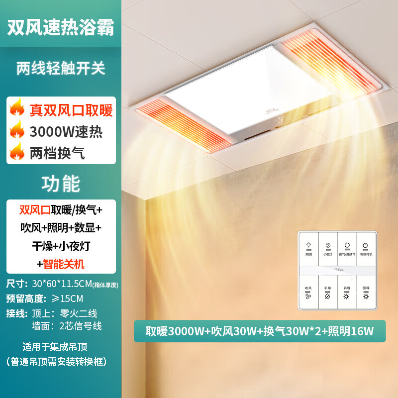2、家里装修找的吊顶商家原本有配风暖浴霸,无奈是6500k冷光固定色温,且功能单一,还贵。于是,转而在京东上找,结果找到了可以调节色温的(3500k-6500k)的这款产品,终于可以和我家全屋色温匹配上,统一起来,不那么突兀,且还是双风口,功能也比吊顶商家的多,太可了。等我家刷完漆,安装吊顶后就能装上这款产品,但时候实际使用看看是不是如期待那样。
