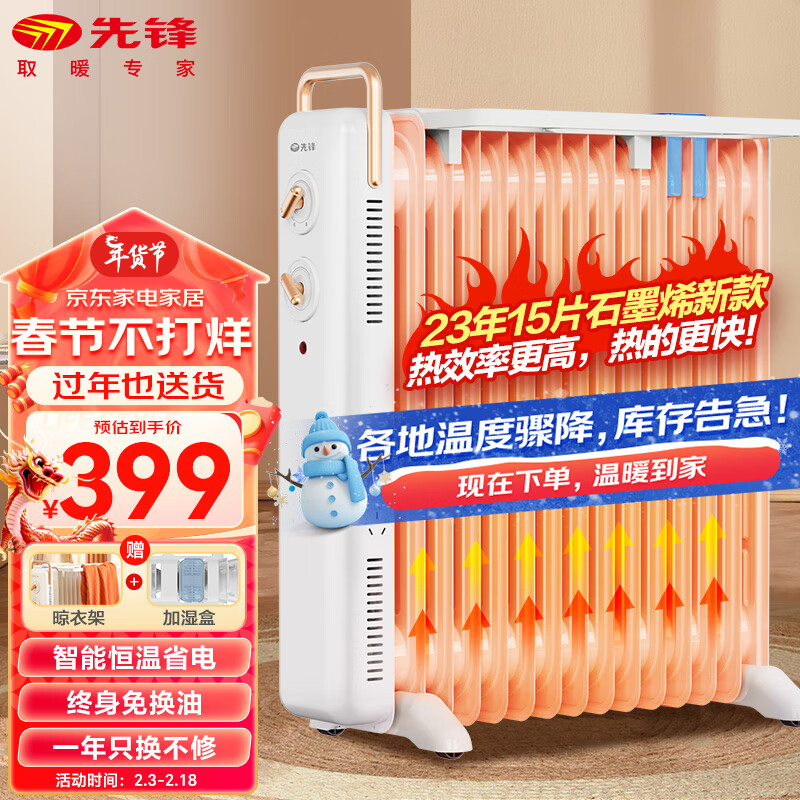 先锋(SINGFUN)取暖器/电热油汀/石墨烯加热电暖器/立式电暖气片 加热器家用恒温加湿加厚15片油汀DYT-Z21价格:399.00元!