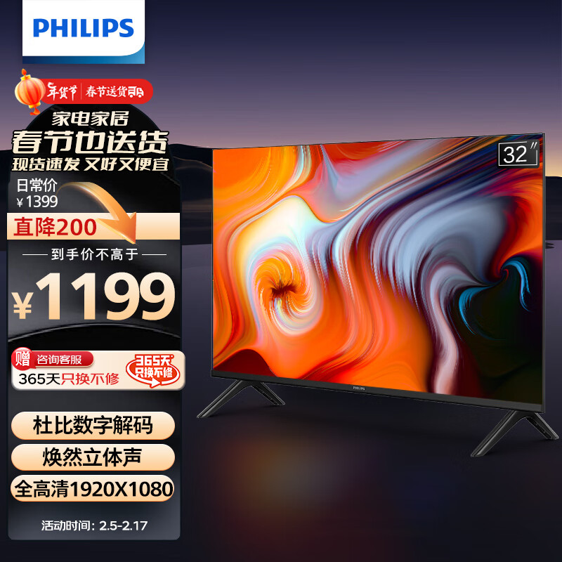 飞利浦(PHILIPS)32英寸全高清智慧屏老年人家用小屏 无线投屏教育智能平板液晶电视机 32PFF6899/T3以旧换新价格:1199.00元!