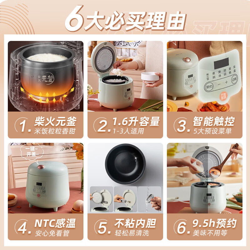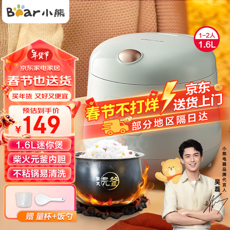 小熊(Bear) 迷你电饭煲 小型家用电饭煲1-2人电饭锅1.6L多功能智能预约煲汤煮粥还原柴火饭不粘元釜内胆 迷你 小饭煲 1.6L价格:199.00元!