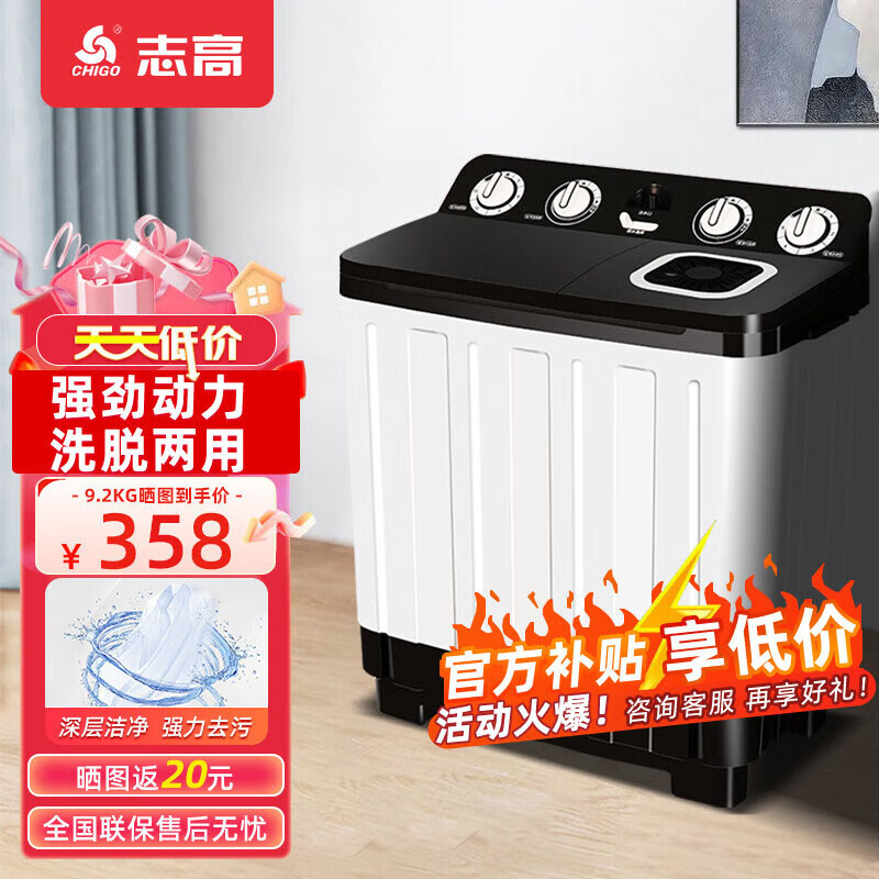 志高(CHIGO)半自动波轮洗衣机大容量 宿舍租房家用商用双桶双缸 脱水甩干机 强劲动力洗大件XPB92-8168S黑色价格:378.00元!