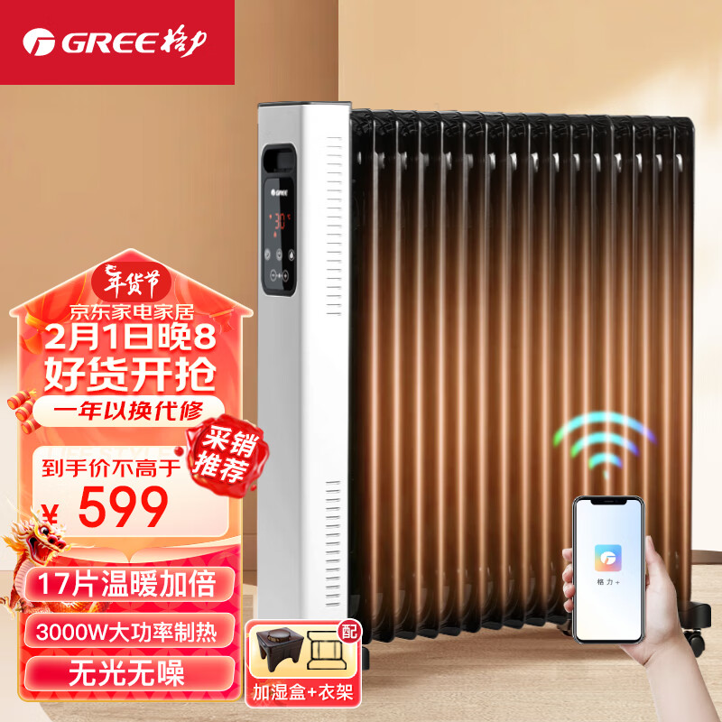 格力(GREE)取暖器/电暖器/电暖气/电油汀取暖器家用17片遥控全屋速热加湿烘衣 NY22-S7030B价格:629.00元!