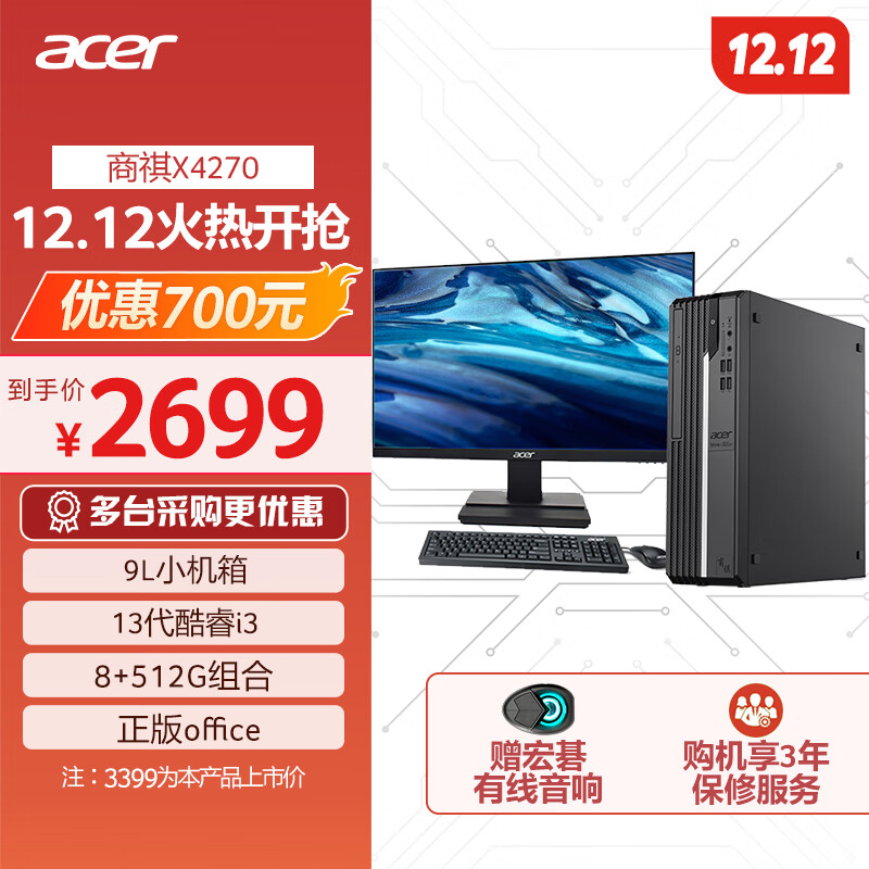 宏碁(Acer)· 未来商务台式机主机 商用办公电脑整机 (13代i3-13100 8G 512G) 商祺X4270 560N 23.8英寸价格:2699.00元!