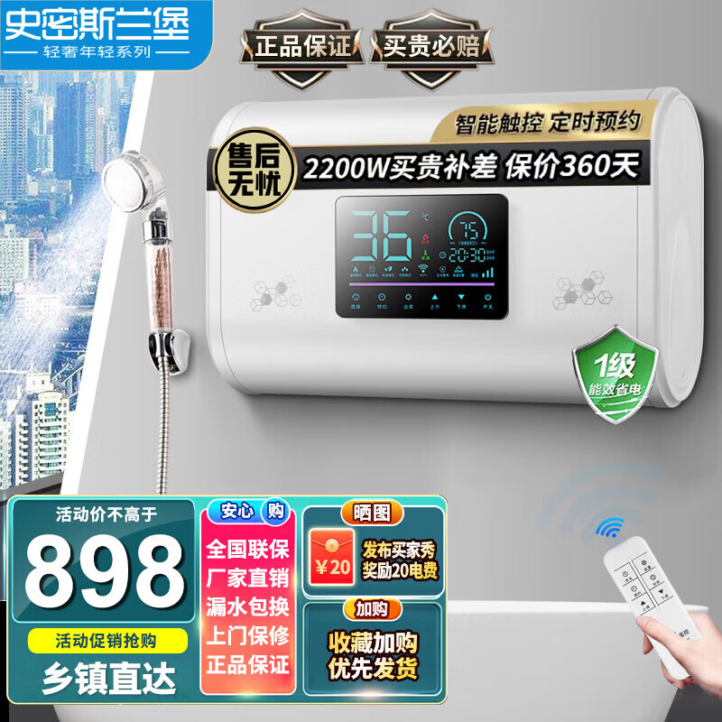 史密斯兰堡储水式电热水器80升扁桶家用洗澡沐浴2200W遥控定时预约变频电脑款+出水断电一级能效DSZF-T07Y80价格:878.00元!