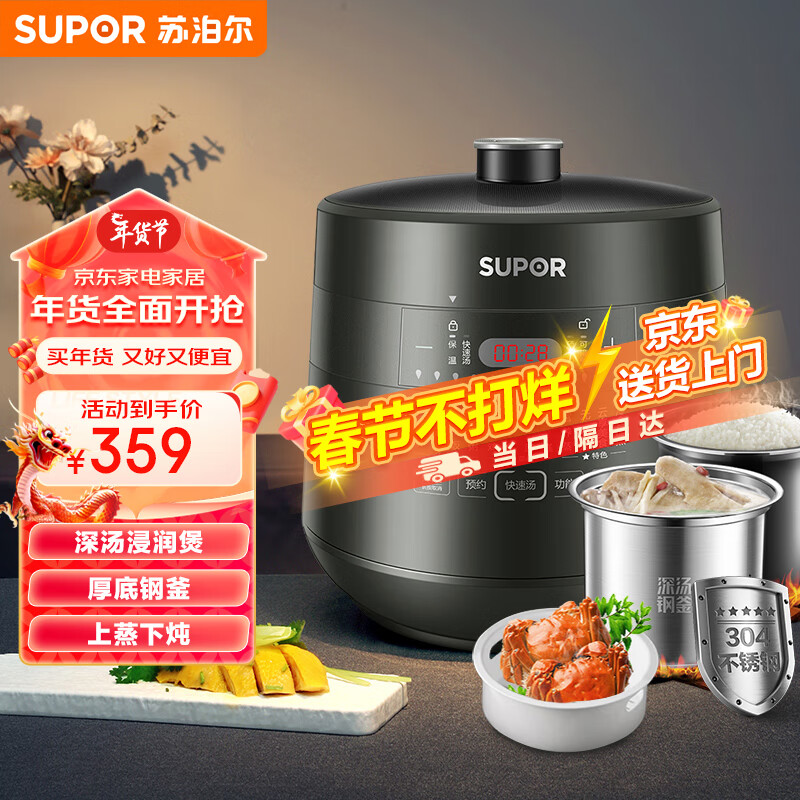 苏泊尔(SUPOR)深汤系列电锅5L 家用智能 上蒸下煮 钢胆厚釜 大屏触控智能预约SY-50YC8082G双胆电饭煲高压锅价格:349.00元!
