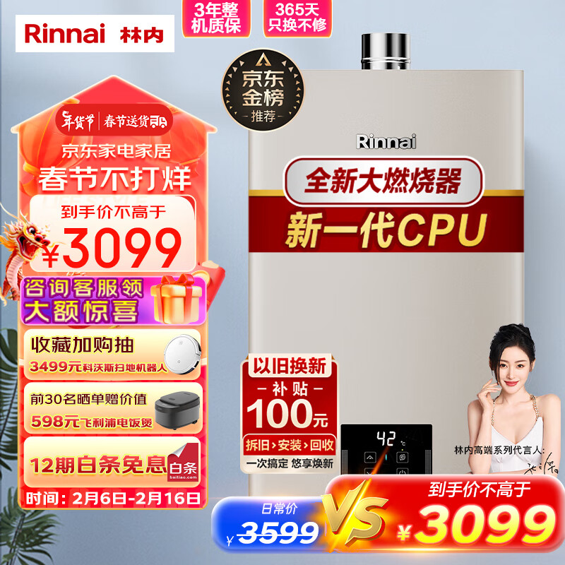 林内(Rinnai)13升燃气热水器 全新智慧芯 恒温再升级 焕境系列 天然气12T RUS-13GD32(JSQ26-GD32)价格:3099.00元!