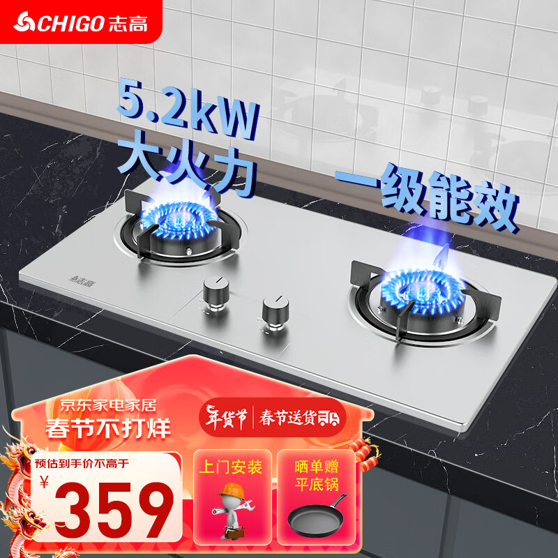 志高(CHIGO)燃气灶天然气灶双灶家用煤气灶不锈钢灶具猛火灶 台嵌两用双灶 5.2kW 一级能效 JZT-T152价格:409.00元!