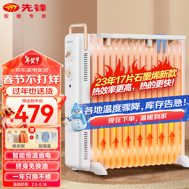 先锋(SINGFUN)取暖器/电热油汀/石墨烯加热电暖器/立式电暖气片 加热器家用恒温加湿加厚17片油汀DYT-Z21pro价格:499.00元!
