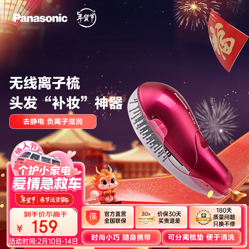 松下(Panasonic)无线离子梳 负离子美发梳迷你两用按摩蓬松梳外出护发器电梳子 新年礼物EH-HE10红色价格:159.00元!