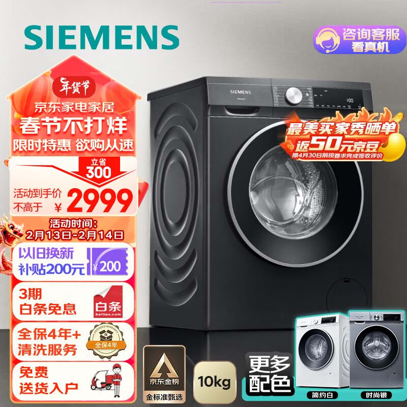 西门子(SIEMENS)iQ300 曜石黑系列10公斤滚筒洗衣机全自动 智能除渍 除螨 变频节能 防过敏 除菌洗 U20W价格:3299.00元!