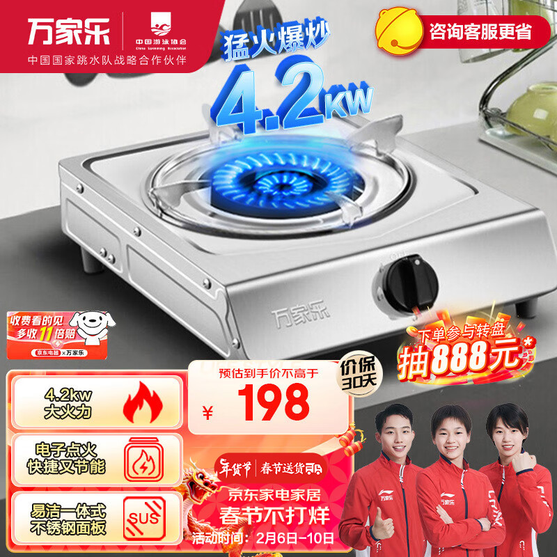 万家乐燃气灶单灶 4.2kW台式煤气灶家用燃气灶 猛火节能 不锈钢面板JZY-TG10液化气价格:198.00元!