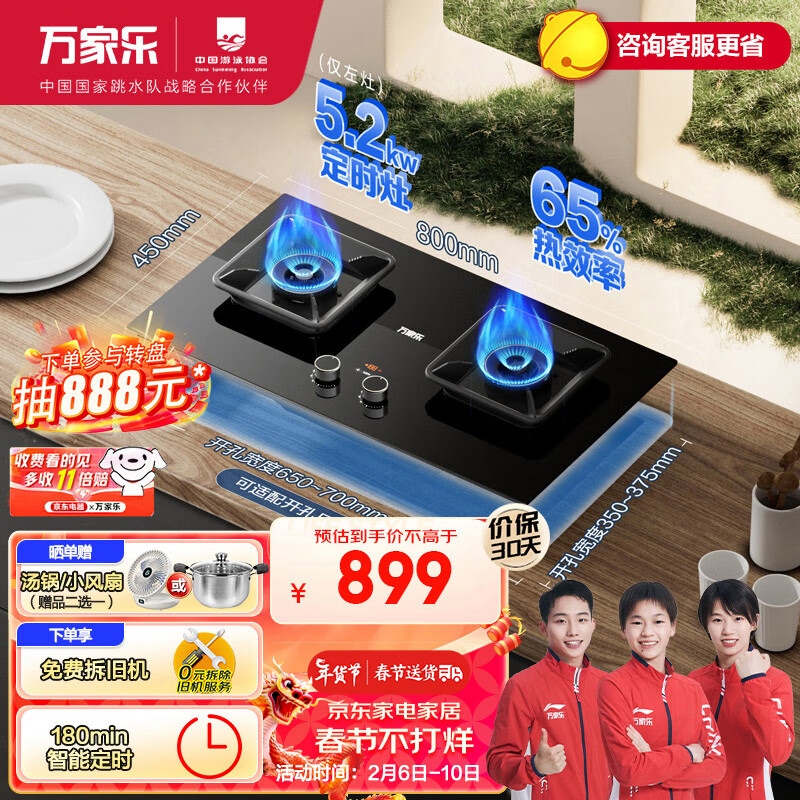 万家乐燃气灶5.2kW火力 家用嵌入式燃气灶具 大尺寸钢化玻璃面板 左边智能定时灶全进风JZT-KV065B天然气价格:999.00元!