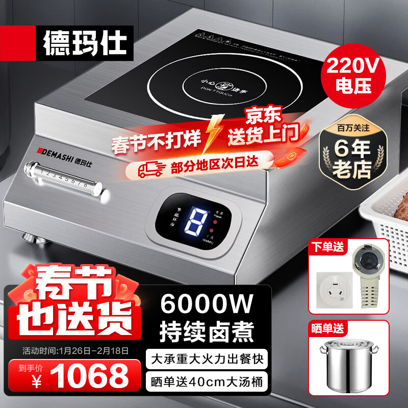 德玛仕(DEMASHI)商用电磁炉大功率 6000W大功率电磁炉商业火锅电池炉 平面商用电磁灶不锈钢 IH-TT-6000W【220V】价格:1068.00元!