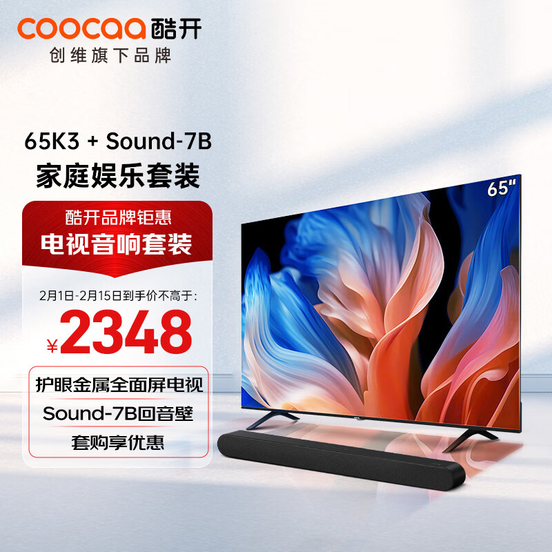 酷开创维K3 65英寸电视 护眼金属屏电视机+Sound-7B木制回音壁 家庭影院KTV 立体环绕DSP数字音响价格:2348.00元!
