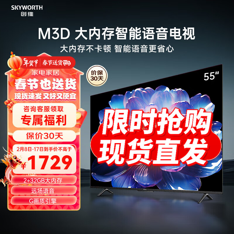 创维电视55M3D 55英寸 2+32GB大内存远场语音 4K高清智慧屏超薄液晶平板电视机 以旧换新55A3D价格:1729.00元!