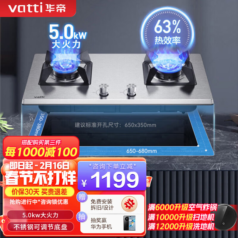 华帝(VATTI)i10065A家用不锈钢燃气灶5.0kw大火力灶具台嵌两用双炉头一级能效可调节开孔 燃气灶 液化气价格:1199.00元!