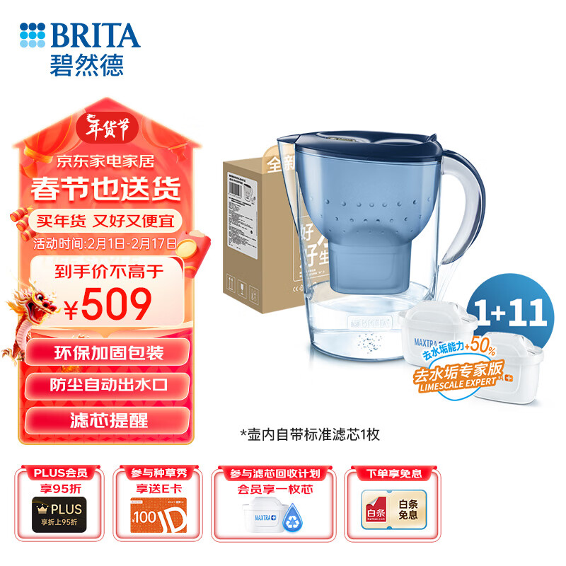碧然德(BRITA)过滤净水器 家用滤水壶 海洋系列 3.5L(蓝色)+去水垢专家版滤芯11枚 环保加固包装价格:509.00元!