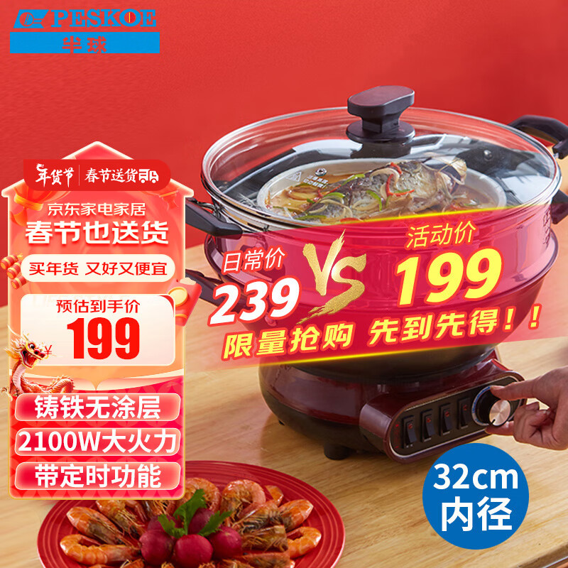 半球(Peskoe)电蒸锅定时款电炒锅加厚铸铁电锅多用途锅多功能电热锅 电火锅电煮锅DT4-34价格:239.00元!