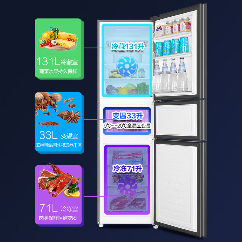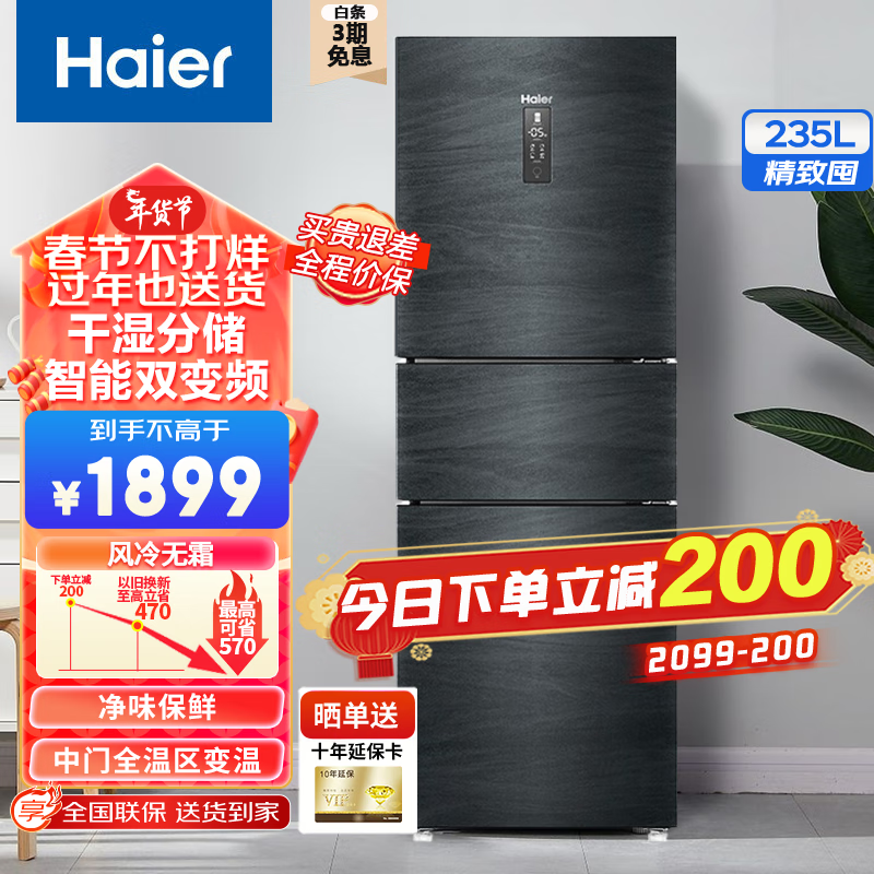 海尔(Haier)冰箱三开门风冷无霜 智能双变频一级能效 干湿分储 家用小型节能电冰箱价格:1898.00元!