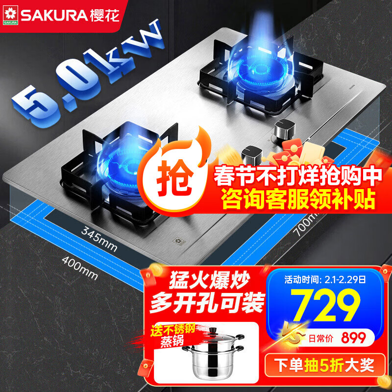 樱花(SAKURA)燃气灶天然气煤气灶双灶液化气家用台嵌两用家用不锈钢灶台一级能效大尺寸多开孔猛火灶 ADG05A 液化气5KW大火力可调节底盘价格:723.00元!