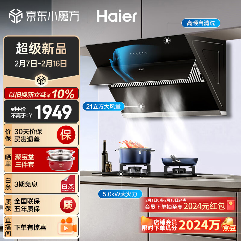海尔(Haier)抽油烟机 侧吸式烟灶套装 21m3/min大吸力 挥手智控 自动清洗 油烟机灶具套装 MA2C1价格:1999.00元!