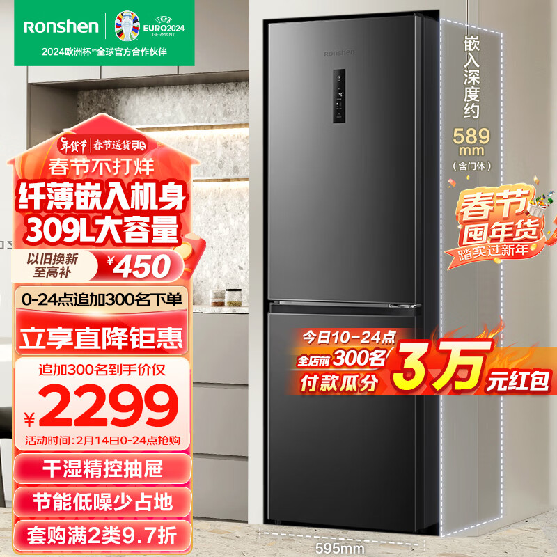 容声(Ronshen)309升两门双开门家用风冷无霜节能低噪冰箱纤薄大容量BCD-309WRS1DE干湿精储大冷冻空间价格:2299.00元!