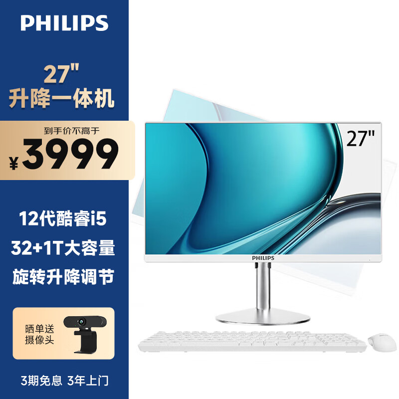 飞利浦S9 27英寸旋转升降台式一体机电脑 家用网课学习办公主机(12代i5 12450H 32G 1TB SSD双频WiFi)白价格:3999.00元!