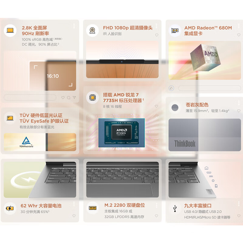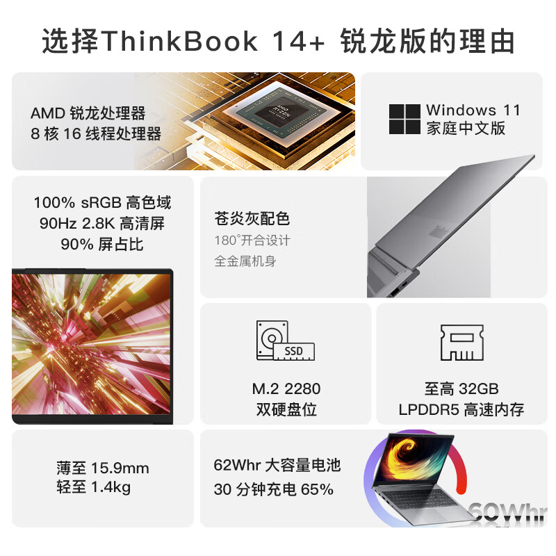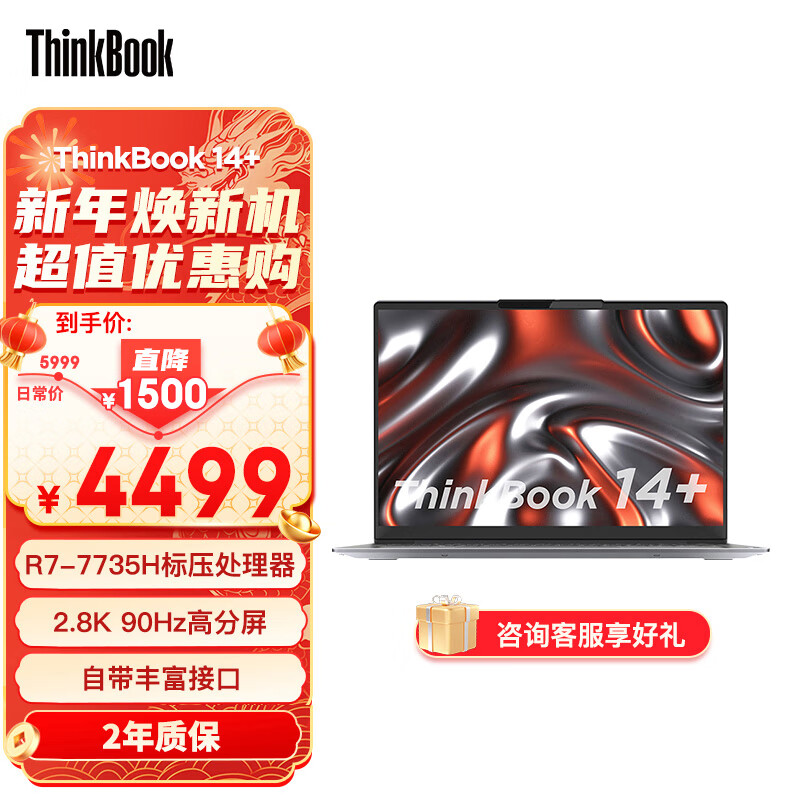 ThinkPad联想ThinkBook 14+ 锐龙版 14英寸标压便携轻薄办公笔记本电脑R7-7735H 16G 512G 2.8K 90Hz价格:4499.00元!