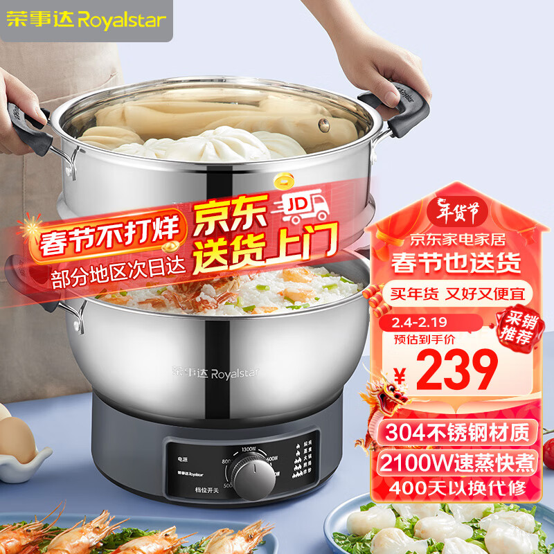 荣事达(Royalstar)电炒锅电蒸锅多功能电热锅多用电火锅电煮锅单层大容量电锅RDG-32X单笼价格:239.00元!