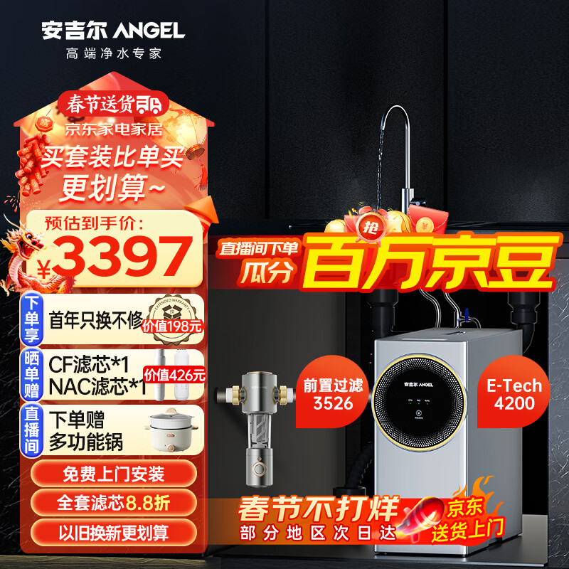 安吉尔净水器家用 全屋净水套装 前置过滤器RO反渗透纯水机套餐 1600G流速体验E-Tech4200+3526价格:3397.00元!
