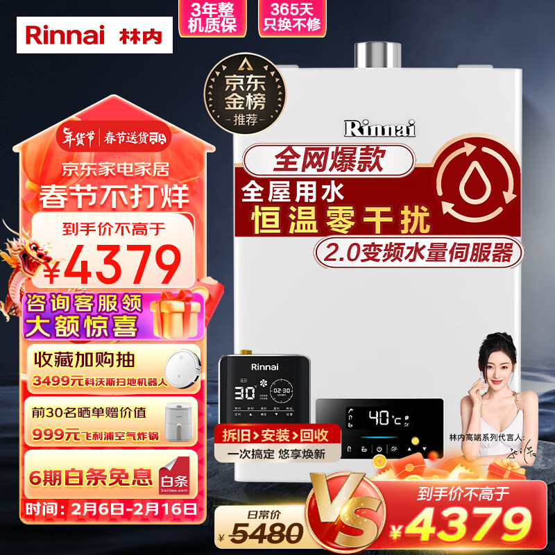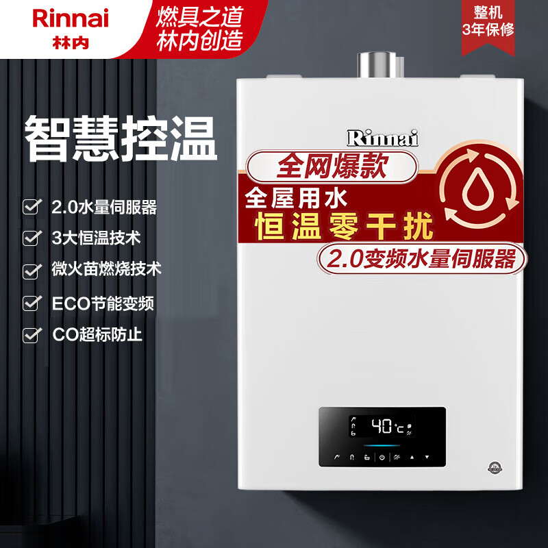 林内(Rinnai)13升零冷水套装水量伺服器防冻燃气热水器下置风机天然气RUS-13QC06+SG (JSQ26-C06)价格:4379.00元!