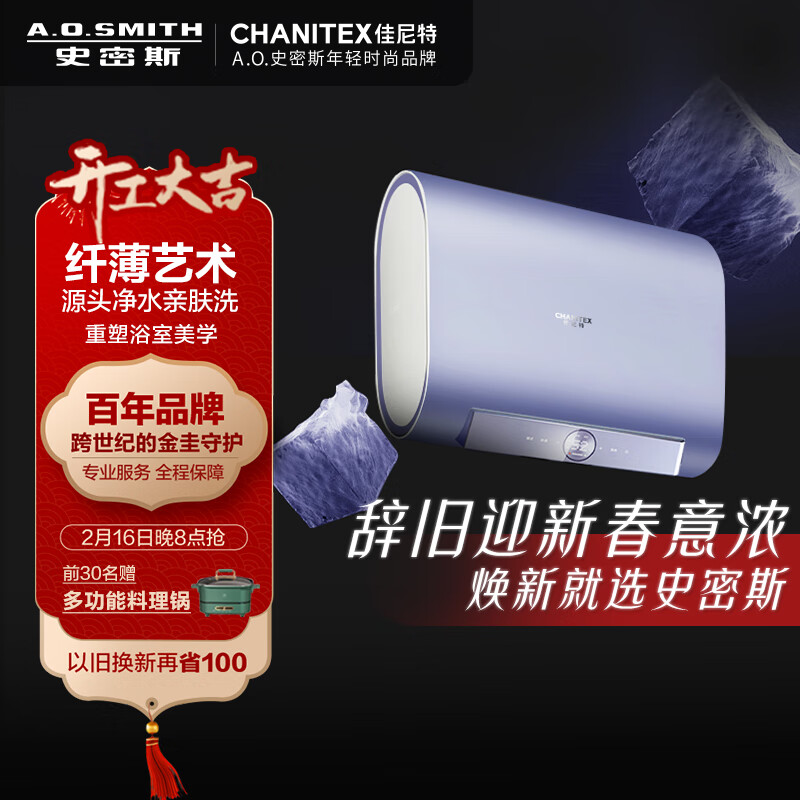 史密斯(A.O.SMITH)佳尼特60升电热水器 纤薄双胆扁桶 小尺寸速热 智能操控 专利免清洗 净水亲肤 CTE-60HT2 京东小家价格:3398.00元!