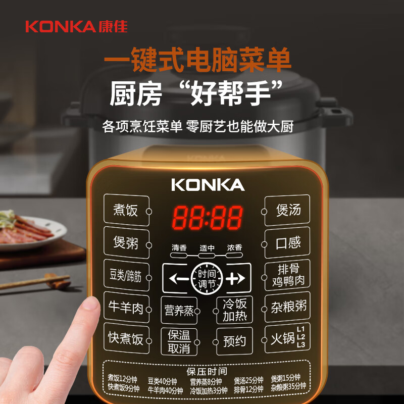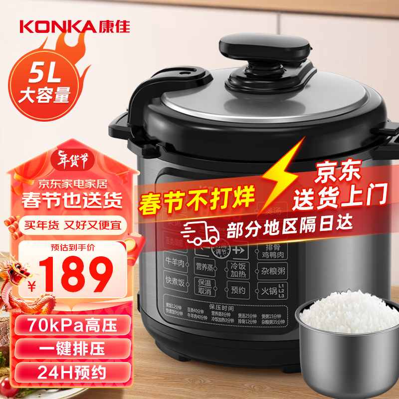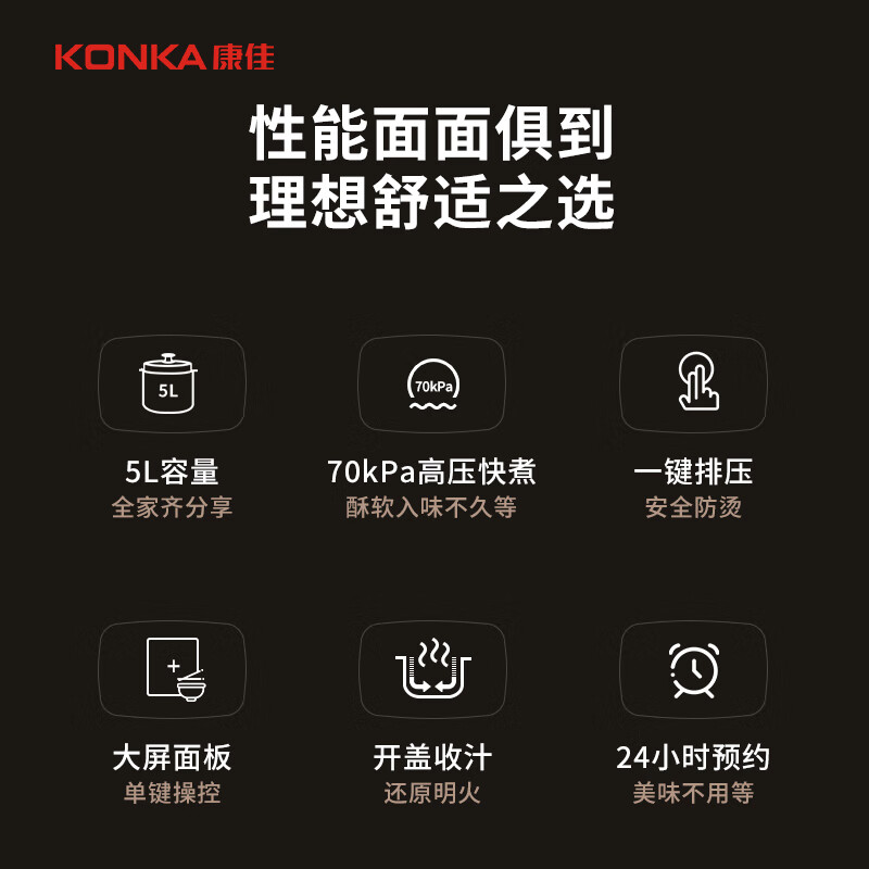 康佳(KONKA)智能电锅 5L家用多功能 不粘内胆 智能预约 收汁入味 大火力 高压锅KYLG-5006E-W价格:189.00元!