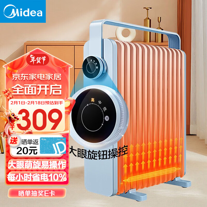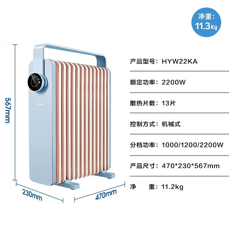 美的(Midea)取暖器 电热油汀 电暖器 电暖气片 暖风机家用 节能省电旋钮操控2200W功率加湿烘衣客厅暖脚烤火炉 【蓝色经典款】22KA价格:459.00元!