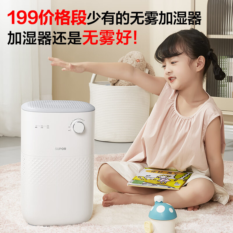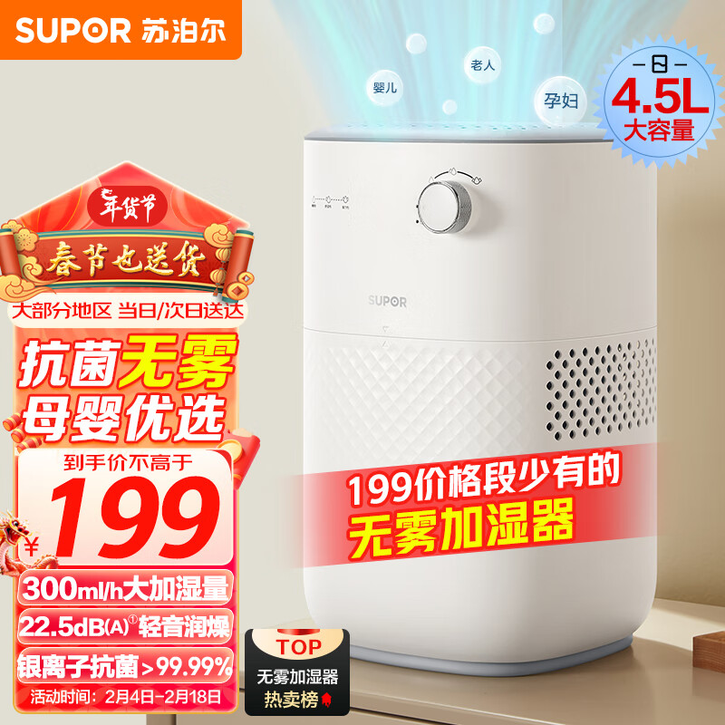 苏泊尔(SUPOR)无雾加湿器4.5L卧室家用桌面大容量婴儿孕妇轻音除菌空气加湿器净化宿舍EHTN-06A价格:199.00元!