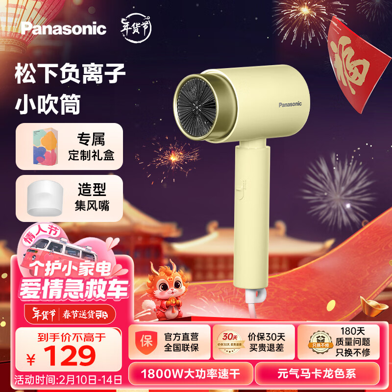 松下(Panasonic)电吹风机大功率高速大风力速干便携送学生宿舍家用负离子护发新年礼物电吹风筒EH-WNE5H礼盒款黄价格:129.00元!