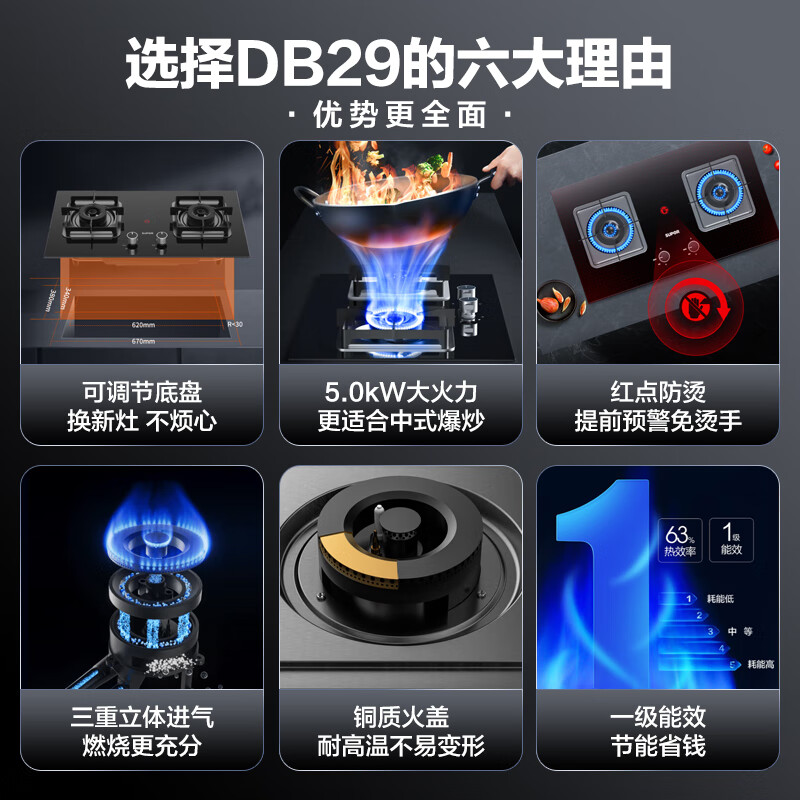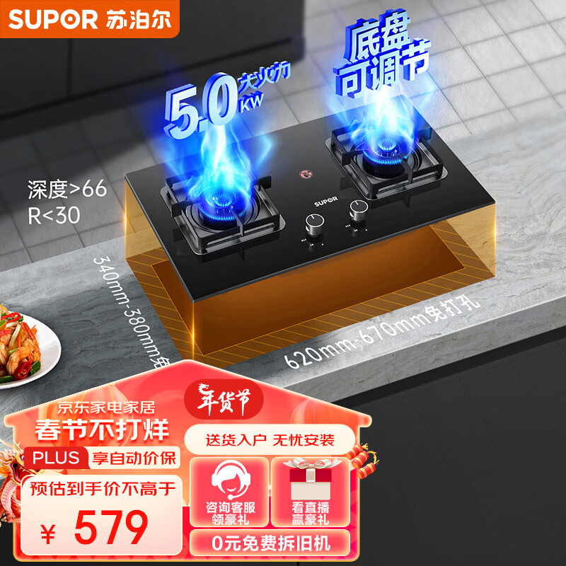 苏泊尔(SUPOR)燃气灶家用天然气灶 免改孔可调节支架灶具 台嵌两用双灶具 5.0kW大火力 DB29天价格:579.00元!