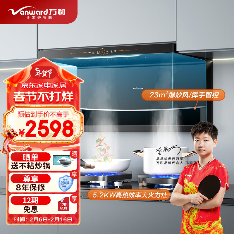 万和(Vanward)顶侧双吸7字型烟灶套装家用 23m3/min大吸力 智感热清洗 挥手控制 WL856+G8L90(天然气)价格:2598.00元!