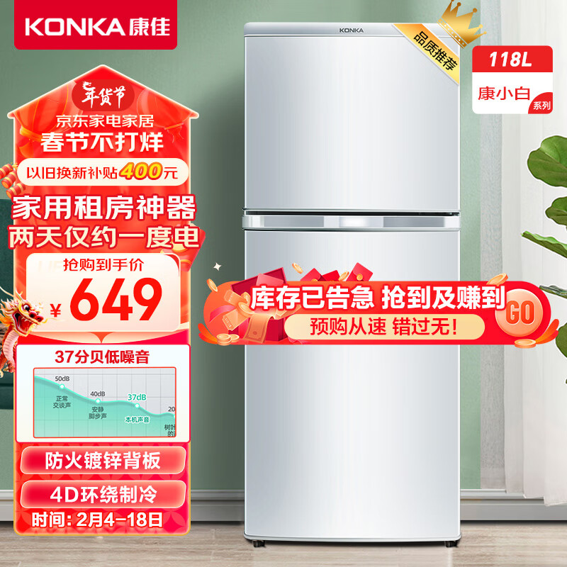 康佳118升两门双门二门冰箱节能低噪小型家用电冰箱迷你宿舍租房小巧不占地两天仅约一度电BCD-118GB2S价格:649.00元!