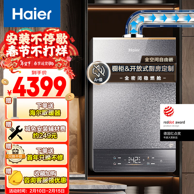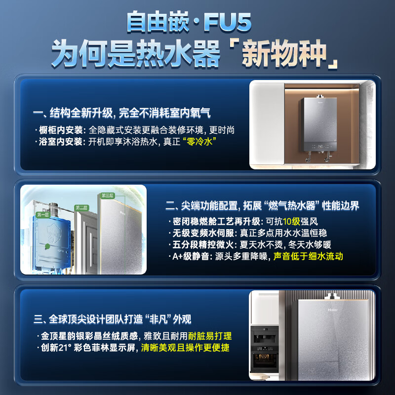 海尔(Haier)16升燃气热水器天然气全密闭稳燃舱 浴室安装 开放式厨房橱柜隐藏安装 自由嵌静音JSG31-16FU5BPU1价格:4789.00元!