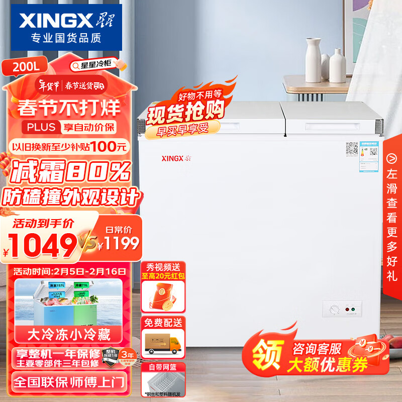 星星(XINGX) 200升 微霜商用卧式冰柜 左冷冻右冷藏卧式冰箱 顶开门双温双箱减霜80%冷柜 BCD-200GE价格:1049.00元!