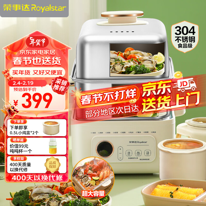 荣事达(Royalstar)电蒸锅 家用多功能电蒸笼蒸炖锅 隔水炖盅全自动预约定时 蒸汽烹饪 不锈钢蒸汽蒸锅RS-ZG150A价格:399.00元!