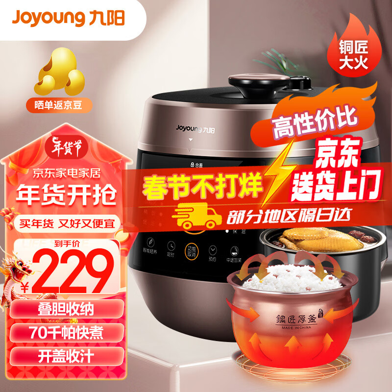 九阳(Joyoung)5升智能家用一锅双胆多功能电锅开盖营养煮高压锅预约定时年货送长辈送老人Y-50C82价格:229.00元!