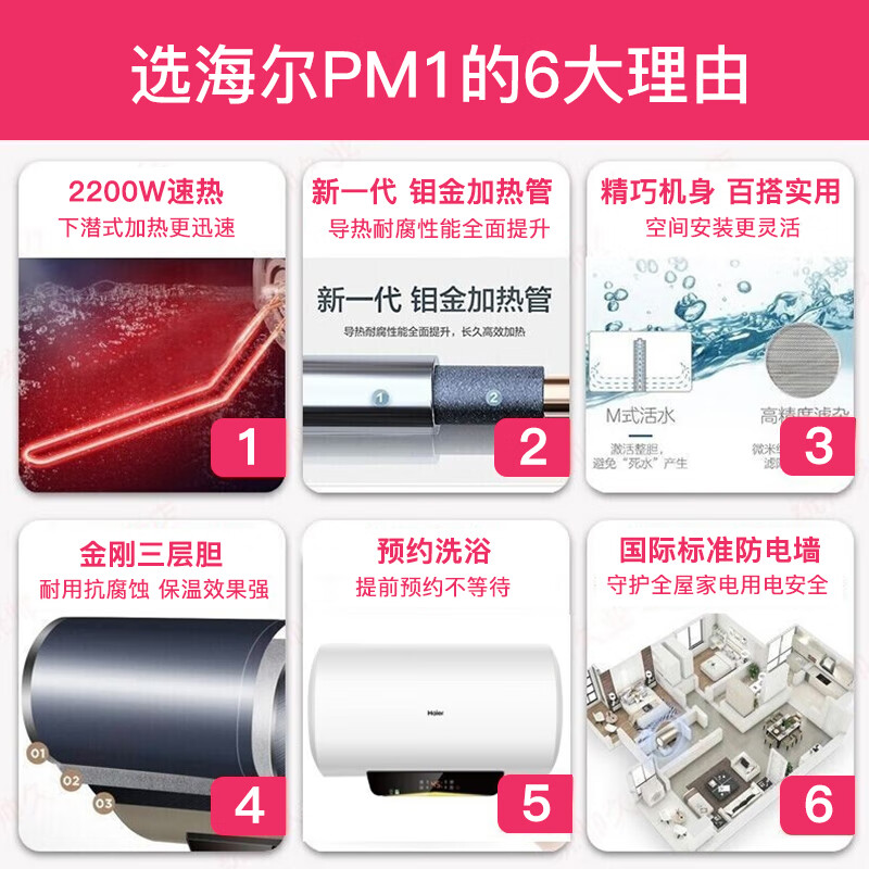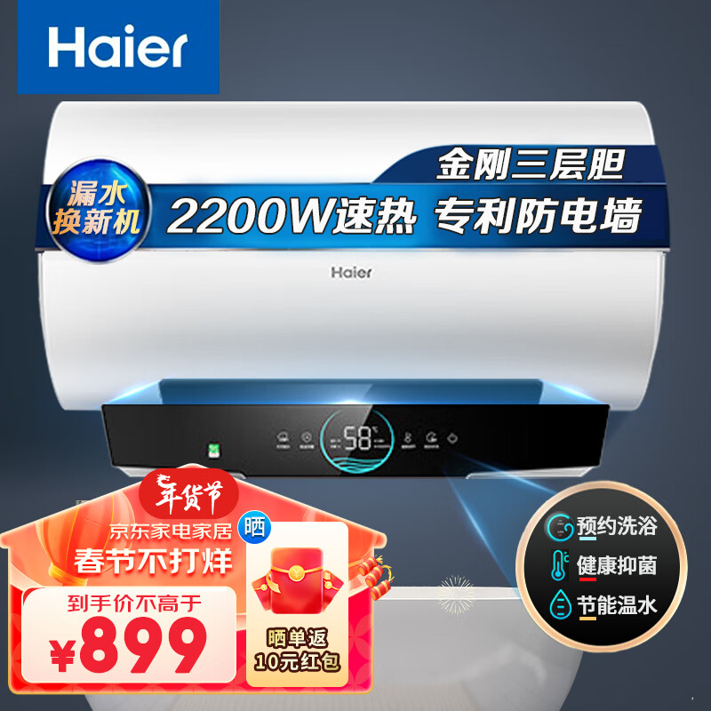 海尔(Haier)电热水器60升 家用储水式2200W速热 健康杀菌80%输出率 健康洗浴金刚三层胆PM1 以旧换新价格:899.00元!